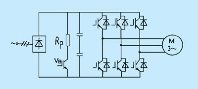 (2) 第二種辦法是采用"放"的辦法,可以采用由分流電阻器Rp和開關(guān)管VB組成的泵升電壓限制電路,如圖2所示。也就是將回饋能量消耗在電阻上,這是一種耗能的方法,對節(jié)能不利。尤其是在大容量或者大慣量拖動系統(tǒng)中,能量的損失較大。當然也可以采用現(xiàn)成的變頻器選件:制動單元和制動電阻來實現(xiàn),其原理與圖2是一樣的,只是投資更大,耗能也更大而已。