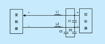 這里主要講電磁干擾(EMI)問題,即變頻器對微電腦控制器,傳感(變送)器及通訊設備的干擾問題。因為變頻器是一個很強的電磁干擾源,變頻器中的開關(guān)電源,以及產(chǎn)生的SPWM電壓波形,會對控制及通訊系統(tǒng)造成很大的干擾。干擾的途徑,除了感應、輻射之外,也包括傳導干擾,即通過連接導線傳導的干擾。在控制系統(tǒng)中,變頻器只是一個執(zhí)行機構(gòu),它的運行頻率(速度)指令要由控制器通過對油井產(chǎn)液量等信號的控制運算后向變頻器發(fā)出,變頻器設置成根據(jù)外部信號運行的工作方式。變頻器就通過這根信號線,給微電腦控制器造成了很大的干擾,以致使控制器無法正常工作。因為是傳導性干擾,采用屏蔽線是不解決問題的,要從信號線上的共模及差模干擾入手,如圖6所示,才能真正解決干擾問題。