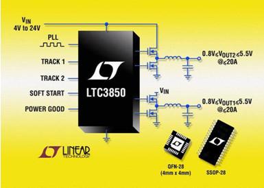 美國加利福尼亞州MILPITAS——2007年7月3日——Linear Technology Corporation宣布推出LTC3850產(chǎn)品,這是一種效率達到95%的雙輸出同步降壓型開關穩(wěn)壓控制器,可驅(qū)動所有N通道功率MOSFET 級(使用同時和比率跟蹤)。4V - 24V 輸入范圍涵蓋了各種不同的應用,包括大多數(shù)中間總線電壓和電池參數(shù)。強大的板載驅(qū)動器允許使用高功率外部MOSFET,可產(chǎn)生高達20A的輸出電流,輸出電壓范圍在0.8V至5.5V之間。應用領域包括筆記本電腦和平板電腦、便攜式儀器、數(shù)據(jù)通信、電信、機頂盒、基站和多功能打印機,在這些應用中降壓型DC/DC轉換器必須提供高功率輸出,同時具有較低熱耗散和較小的尺寸。