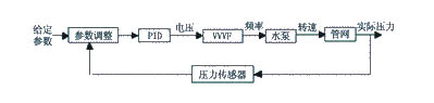 由壓力傳感器反饋的水壓信號(hào)(4-20ma)直接送入變頻器的a/d口,設(shè)定給定壓力值,pid參數(shù)值,并通過變頻器內(nèi)部計(jì)算公式確定何時(shí)需切換泵,系統(tǒng)參數(shù)在實(shí)際運(yùn)行中調(diào)整,使系統(tǒng)控制響應(yīng)趨于完整,如圖2所示。