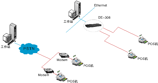 現(xiàn)客戶采用新的方案(如上圖右上圖所示),銀行信用業(yè)務(wù)主機(jī)可以直接通過城市廣域網(wǎng),以Ethernet方式訪問DE-308下面連接的POS機(jī)。顧客使用POS機(jī)時(shí),DE-308可以實(shí)時(shí)把收到的數(shù)據(jù)通過網(wǎng)絡(luò)傳向銀行主機(jī),而主機(jī)亦可快速回復(fù)收到的響應(yīng),對(duì)顧客做到高效、快捷的服務(wù),并且受接入數(shù)量的影響較小,可最大限度的利用硬件的性能。