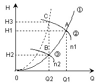 下圖中,曲線①為風(fēng)機(jī)(水泵)阻力特性,曲線②為工頻速度下的流量與壓力關(guān)系曲線,此時(shí)風(fēng)機(jī)水泵工作在A點(diǎn)時(shí),軸功率P1與Q1 、H1乘積,即圖中面積AQ10H1A成正比。若要將流量從Q1降到Q2,如用 風(fēng)門(擋板),則工作點(diǎn)由A移到C,流量下降,壓力上升,軸功率減少不多,減少的能量被擋板消耗;若采用變頻調(diào)速,則工作點(diǎn)由A移到B,在滿足同樣流量Q2的情況下,壓力也下降,軸功率大大降低,且沒有擋板損耗。假設(shè)電機(jī)的運(yùn)行頻率由工頻下調(diào)到35Hz時(shí),則