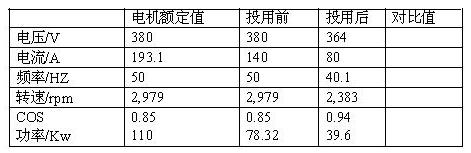 變頻調(diào)速器投用后,控制回路的穩(wěn)定性和可靠性比調(diào)節(jié)閥有明顯提高,控制偏差保持在±1%以內(nèi),被控參數(shù)波動幅值較小。電機在變頻調(diào)速器的控制下保持中速運行狀態(tài)。在電機啟動、控制過程中實行延時斜升、斜降,并且有輸出短路、欠壓、過流、過載過熱等報警跳閘及在線故障診斷功能,保證其運行安全可靠,降低故障率,減少了設備損耗,尤其顯著的是節(jié)能效果相當明顯。在正常工況下,投用前后的電氣參數(shù)如下:
