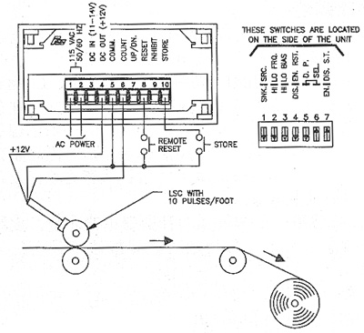 將APOLLO累加器的小數(shù)點顯示位置設(shè)在十位處時,累加器個位顯示數(shù)字的單位恰好為1/10英尺。在這一應(yīng)用中,該累加器的前屏復(fù)位按扭被鎖定,而在遠(yuǎn)程復(fù)位(Remote Reset)端子與公共(Comm)端之間連接一開關(guān),計數(shù)器的復(fù)位只能通過該開關(guān)實現(xiàn)。
