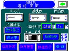 5) 在“運(yùn)轉(zhuǎn)畫面”中,按工藝要求選擇接頭儀、凹凸儀的開與關(guān),以及設(shè)備的“自動(dòng)”和“手動(dòng)”狀態(tài),在“手動(dòng)”狀態(tài),接頭儀等不報(bào)警;