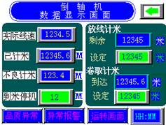 4) 在“數(shù)據(jù)顯示畫面”中,按工作的需要設(shè)定“卷取計(jì)米”“放線計(jì)米”“到米停機(jī)”這些必要的工藝參數(shù),其中“到米停機(jī)”要根據(jù)現(xiàn)場的實(shí)際情況來設(shè)定;