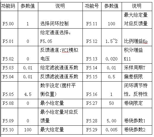 依上圖將張力擺桿電位器接入EV-1000的相應(yīng)接線端子,調(diào)整變頻器參數(shù)中的相關(guān)參數(shù)如下: