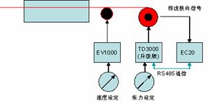 分析:如果不考慮上述限制條件,上述工藝通過一個非常普通的中心收卷方案就可以解決。因為艾默生有專門針對此類工藝的TD3300張力控制專用變頻器,可是TD3300變頻器三種張力控制方式所要求的條件(張力反饋信號或張力開環(huán)閉環(huán)矢量轉(zhuǎn)矩模式)均不具備。為此,我們?yōu)閺S家提供了如下的解決方案,并得到了廠家認(rèn)可。