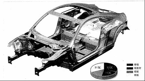 新型奧迪TT轎車使用了鋁合金和鋼材兩種材料制造車架,這一復合材料車架的優(yōu)點在于可以按照功能需要選擇合適的材料。例如利用鋼材制造轎車的行李艙,其尾部的軸向承載能力大大提高,而車架的其它部位使用鋁合金材料,使車架及整車的重量盡可能地減輕——車架的重量只有206kg,其中69%的重量來自鋁合金材料,31%的重量來自鋼材。