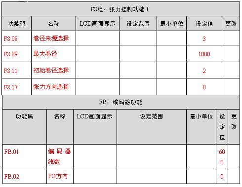 ?。?)在程序中設(shè)定空芯卷徑和最大卷徑的數(shù)值。通過前面卷徑計(jì)算的公式算出電機(jī)尾部所加編碼器產(chǎn)生的最大脈沖量(P2)和最低脈沖量(P2)。通過算出的最大脈沖量對(duì)收卷電機(jī)的速度進(jìn)行限定,因?yàn)樽冾l器用作張力控制時(shí),如果不對(duì)最高速進(jìn)行限定,一旦出現(xiàn)斷紗等情況,收卷電機(jī)會(huì)飛車的。最低脈沖量是為了避免收卷變頻器運(yùn)行在2Hz以下,因?yàn)樽冾l器在2Hz以下運(yùn)行時(shí),電機(jī)的轉(zhuǎn)矩特性很差,會(huì)出現(xiàn)抖動(dòng)的現(xiàn)象。