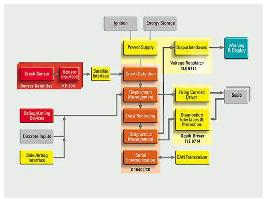 高度集成的功率器件能夠縮小板空間和減少引腳數(shù)量,故而適于安全氣囊應(yīng)用。并帶有用于點燃和測試引爆器的專用IC(ASIC),全面集成帶有升壓和降壓轉(zhuǎn)換器的電源。這種集成通過在單塊芯片上整合雙極晶體管、CMOS和DMOS的智能電源技術(shù)來實現(xiàn)。