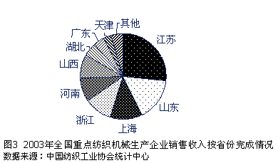 2003年中國紡織工業(yè)協(xié)會的統(tǒng)計數(shù)據(jù)表明,紡織行業(yè)主要集中在江蘇、浙江、上海、山東、廣東、福建等經(jīng)濟發(fā)達的沿海省份,其銷售額占全國的80%。湖北、河北、河南、安徽、天津、遼寧、四川、北京、內(nèi)蒙古、湖南等中部省份占15%,其余省份僅5%。