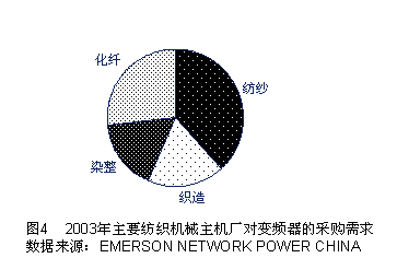 據(jù)作者調(diào)查分析,2003年國內(nèi)紡織化纖機械主機廠對變頻器的采購需求約6億元,由于紡織工藝復雜、機械品種繁多,按紡紗、織造、染整和化纖類整理其需求份額如圖4所示。