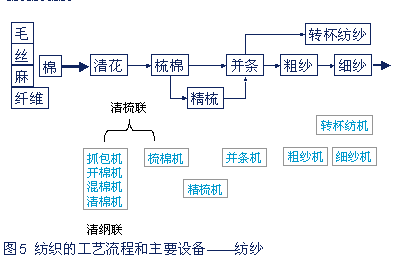紡紗機械負責將棉、毛、麻、絲和化學纖維原料進行除雜、開松、牽伸成為均勻柔韌的細紗。工藝流程和主要設(shè)備見圖5。