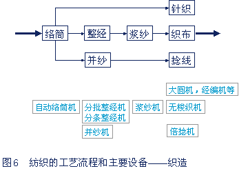 織造機械負責將纖維紗加工成布匹、線繩或針織品。絡(luò)筒、整經(jīng)、漿紗是織布前的準備工藝。工藝流程和主要設(shè)備見圖6。