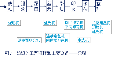 染整機械是布匹和紗線后道處理設(shè)備。按工藝要求可分為煉漂、染色、印花、整理等工序,在每道工序中,根據(jù)加工織物的不同要求,又進行若干單元操作。其中煉漂包括坯布準備——燒毛——退漿——煮煉——漂白——絲光——熱定型等工序,新的設(shè)計已將這些工序過程組合到退煮漂聯(lián)合機中。工藝流程和主要設(shè)備見圖7所示。