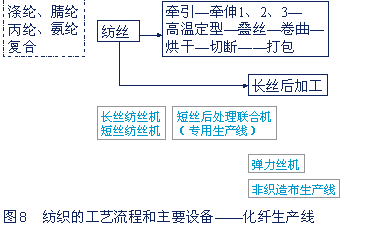 化纖機械包括紡絲機、后處理生產(chǎn)線、彈力絲機、非織造布生產(chǎn)線等。工藝流程和主要設(shè)備示意見圖8。