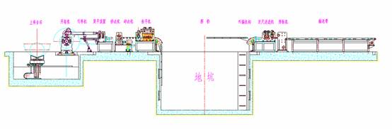 由本生產(chǎn)線的工藝流程可以看出:開卷、展平、修邊、碎邊和校平應(yīng)在一個線速度V1下同步運行。定尺送進和皮帶之間設(shè)有橫剪刀,因此,定尺送進、皮帶和橫剪刀是斷續(xù)運行,同時,它的運行速度V2應(yīng)大于V1。在校平機與定尺送進機之間的緩沖坑,其作用是:平衡V1和V2之間的速度關(guān)系,保證生產(chǎn)線的穩(wěn)定運行。