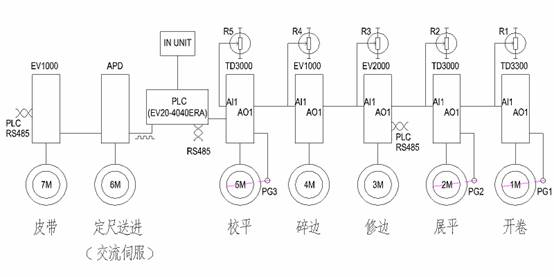 開卷機如何與生產(chǎn)線上的其他設(shè)備同步運行,是開卷生產(chǎn)線電氣控制焦點所在。本生產(chǎn)線采用了TD3300張力控制專用變頻器,成功地解決了開卷機與生產(chǎn)線同步運行的問題。