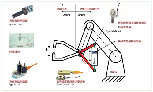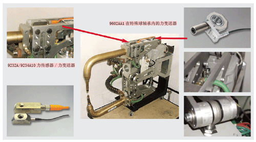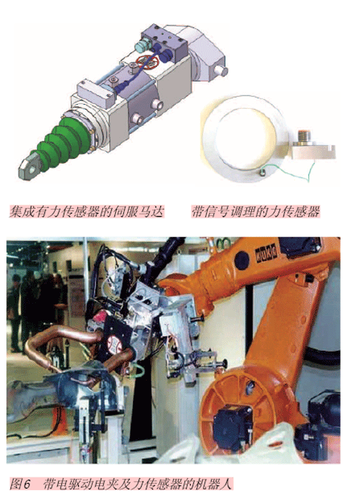 上述介紹的用于間接測(cè)力的應(yīng)變傳感器、變送器,和內(nèi)置于驅(qū)動(dòng)機(jī)構(gòu)或驅(qū)動(dòng)馬達(dá)上的直接測(cè)力傳感器一樣,也可用于機(jī)器人焊夾上力的測(cè)量。以一個(gè)氣動(dòng)C型夾為例,進(jìn)行比較測(cè)量:一個(gè)是電極上的應(yīng)變,一個(gè)是活塞桿上的力傳感器,在一個(gè)在線焊接力的監(jiān)控中,應(yīng)變信號(hào)和直接測(cè)力的信號(hào)顯示出了非常好的一致性。由于電極上的傳感器在生產(chǎn)環(huán)境下不能進(jìn)行充分有效的保護(hù),所以在實(shí)際解決方案中傳感器內(nèi)置在活塞桿上。圖5(左)顯示了一臺(tái)現(xiàn)代伺服焊夾裝有9234A應(yīng)變變送器內(nèi)置于一個(gè)集成電器內(nèi),集成電器回路有一個(gè)可調(diào)的放大器,允許傳感器優(yōu)化調(diào)節(jié)焊接力和焊接過(guò)程。應(yīng)用應(yīng)變傳感器或應(yīng)變變送器的優(yōu)點(diǎn)是簡(jiǎn)化安裝,特別體現(xiàn)在對(duì)已有的焊機(jī)或焊夾進(jìn)行整修和改造中。圖5(右)顯示了一個(gè)力的變送器內(nèi)置于一個(gè)球軸承的直接測(cè)力(作為伺服電夾的典型應(yīng)用)。這種形式的直接測(cè)力用于監(jiān)控或用于電焊機(jī)伺服電夾定常力的校準(zhǔn),還可用于優(yōu)化實(shí)際電焊過(guò)程的時(shí)間和用于焊接連接件的調(diào)整。帶電驅(qū)動(dòng)電夾及力傳感器的機(jī)器人如圖6所示。
