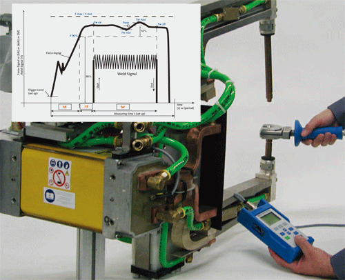 焊接機(jī)器人或機(jī)器上的焊接力可以定期標(biāo)定、數(shù)據(jù)存檔,奇石樂(lè)公司(KISTLER)生產(chǎn)的9831A/B電焊力標(biāo)定變送器可用于該用途。與點(diǎn)焊力監(jiān)控器5825A2一同使用,9831A/B 可以記錄電流開啟時(shí)的力值和點(diǎn)焊時(shí)的其他特征值(如圖2所示),并可直接檢驗(yàn)夾緊力在電流開啟時(shí)是否達(dá)到理想水平(通常為最大力值的90%)。這里最重要的是使被測(cè)力的電極間隙盡可能?。ㄈ鐚?shí)際電焊時(shí)一樣)。在這方面,9831A/B具有極大的優(yōu)越性,該傳感器可測(cè)到最小間隙為3.5mm的電極力。
