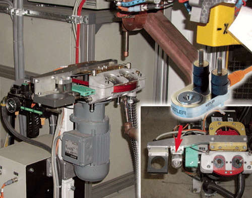 圖5 在伺服電動(dòng)焊夾上裝有應(yīng)變傳感器(左);在伺服電動(dòng)焊夾的球軸承上裝有力傳感器(右)