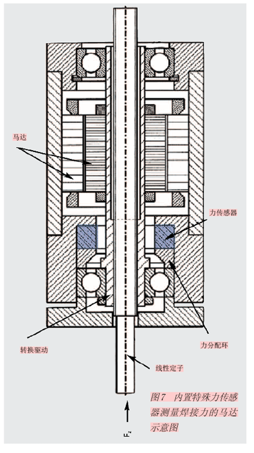對(duì)于電驅(qū)動(dòng)焊接夾理想的解決方案是,直接內(nèi)置一個(gè)力傳感器于驅(qū)動(dòng)馬達(dá)內(nèi)。圖7給出了一個(gè)內(nèi)置力傳感器測(cè)量軸向力Fz的線性馬達(dá),F(xiàn)z同焊接力成比例關(guān)系。這種測(cè)量已被研發(fā)并且成功通過(guò)了在工具定子上的測(cè)試。