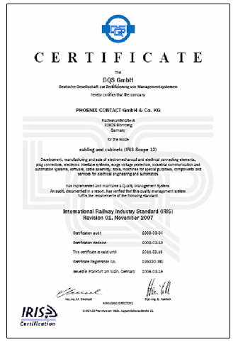 德國菲尼克斯電氣有限公司經(jīng)過2007年的充分準(zhǔn)備,在2008年4月取得了IRIS的認(rèn)證證書。此認(rèn)證在未來將成為國際鐵路標(biāo)準(zhǔn)比較通用的質(zhì)量體系控制和保證的關(guān)鍵認(rèn)證。由于其認(rèn)證要求極高,目前通過的認(rèn)證企業(yè)為數(shù)尚少。菲尼克斯電氣的IRIS認(rèn)證將會極大地推動菲尼克斯電氣在中國鐵路行業(yè)的工作開展。
