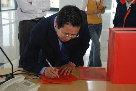 天瑞儀器董事長(zhǎng)劉博士在捐款冊(cè)上簽名