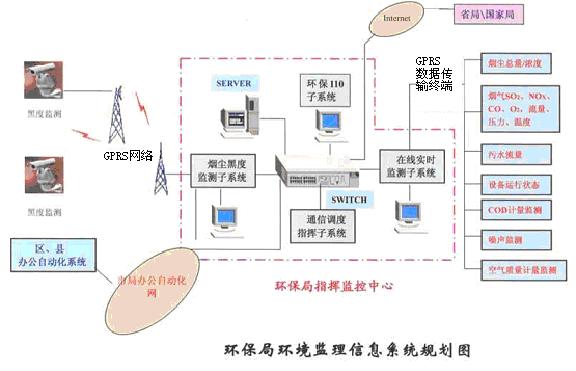 A數(shù)據(jù)采集:前端采用南京崇茂科技有限公司的GPRS無(wú)線數(shù)傳設(shè)備安裝在企業(yè)監(jiān)控點(diǎn)及各環(huán)境(主要是煙塵黑度、污水)監(jiān)測(cè)點(diǎn)。另外利用超聲波及傳感器等把采集的數(shù)據(jù)直接傳輸給無(wú)線數(shù)傳設(shè)備中,24小時(shí)根據(jù)控制中心要求發(fā)送監(jiān)控?cái)?shù)據(jù)到控制中心。