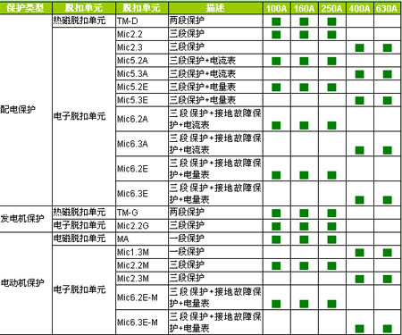 ■ 脫扣單元:TM, Mic2.2, Mic2.3, Mic5.2A, Mic5.3A, Mic5.2E, Mic5.3E, Mic6.2A, Mic6.3A, Mic6.2E, Mic6.3E, MA, 1.3M, Mic6.2E-M, Mic6.3E-M, Mic2.2G等。