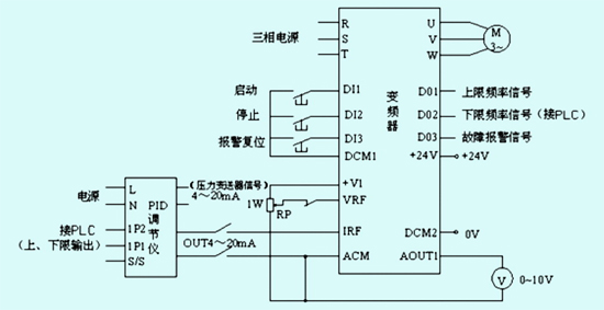 變頻器選用三墾力達(dá)電氣有限公司的shf系列,功率分別為7.5kw,1.5kw和15kw,變頻器采用模擬量控制方式。通過變頻器對(duì)電機(jī)水泵實(shí)現(xiàn)軟啟動(dòng)功能。圖2為pid調(diào)節(jié)器和變頻器的接線圖。變頻器根據(jù)pid調(diào)節(jié)器輸出信號(hào),及時(shí)調(diào)節(jié)輸出頻率,改變電機(jī)和水泵的轉(zhuǎn)速,調(diào)節(jié)系統(tǒng)供水量,使供水管網(wǎng)中的壓力穩(wěn)定在設(shè)定壓力值上。