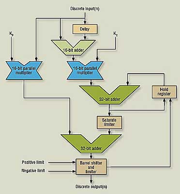 為保持低輸入電平時(shí)的精度,并將輸出重新調(diào)節(jié)到16位變量,積分項(xiàng)的總和具有32位分辨率??癸柡湍K可以在輸出達(dá)到系統(tǒng)的物理極限時(shí),防止積分項(xiàng)飽和。