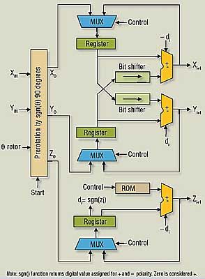 針對基于一系列加法、減法和移位函數(shù),僅在13個(gè)周期內(nèi)就可實(shí)現(xiàn)12位精度的ASIC實(shí)現(xiàn),開發(fā)被稱為CORDIC算法的矢量旋轉(zhuǎn)函數(shù)(圖4)。這種運(yùn)算要比在32位RISC處理器上使用泰勒展開式進(jìn)行運(yùn)算快10倍。