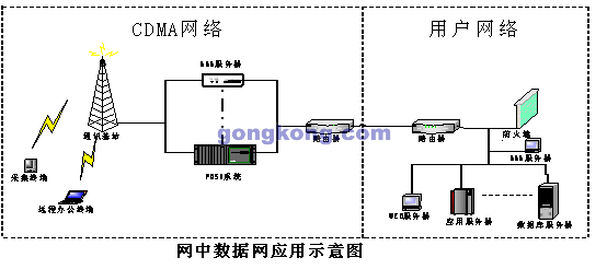 數(shù)據(jù)中心可通過到中國(guó)聯(lián)通CDMA網(wǎng)中數(shù)據(jù)網(wǎng)(VPDN)接入,采用VPDN方式成本比較低,安全性比較高,可充分保障速度和網(wǎng)絡(luò)服務(wù)質(zhì)量。