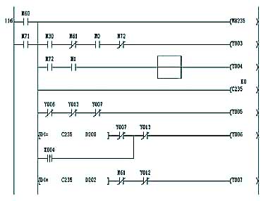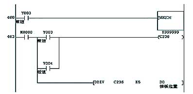 ● 誤差信號(hào)問(wèn)題。編碼器是一種比較精密的光電產(chǎn)品,受振動(dòng)時(shí)不可避免的會(huì)出現(xiàn)誤差信號(hào),而切紙機(jī)在執(zhí)行裁切動(dòng)作時(shí)會(huì)造成很大振動(dòng),如果忽視這個(gè)現(xiàn)象,定位精度和執(zhí)行機(jī)構(gòu)當(dāng)前位置的顯示都會(huì)不準(zhǔn)確。本工程中處理方法參見(jiàn)上面例子程序圖1,只有y3、y4接通,即只有進(jìn)給機(jī)構(gòu)前進(jìn)和后退時(shí)才讓c236進(jìn)行計(jì)數(shù),這樣就屏蔽了裁切時(shí)震動(dòng)造成的誤信號(hào)。