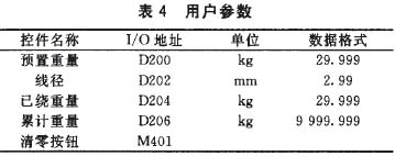 (3)設(shè)有 “用戶參數(shù)”(見表4)、“工藝參數(shù)”和“機械參數(shù)”三個子畫面切換按鈕。