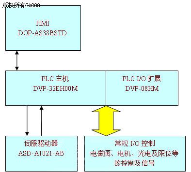 切布機(jī)使用臺(tái)達(dá)機(jī)電產(chǎn)品之配置:PLC:EH系列;觸摸屏HMI:AS38;伺服驅(qū)動(dòng)器:ASD-AB(1KW-L)。具體型號(hào):DOP-AS38BSTD+DVP-32EHOOM+08HM+ASD-A1021-AB+ECMA-C31010ES,參見系統(tǒng)結(jié)構(gòu)圖2所示。