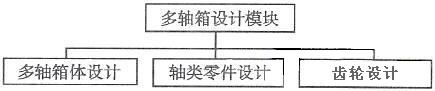 多軸箱的設(shè)計(jì)首先要采用基于裝配的特征建模法建立多軸箱的裝配模型,然后在這個(gè)模型中對零部件展開設(shè)計(jì),多軸箱的設(shè)計(jì)主要包括多軸箱體的設(shè)計(jì)和傳動(dòng)系統(tǒng)的設(shè)計(jì),而傳動(dòng)系統(tǒng)是由若干主軸、傳動(dòng)軸和齒輪組成的。根據(jù)多軸箱的裝配層次,將多軸箱設(shè)計(jì)模塊分為3個(gè)子模塊,如圖1所示。多軸箱設(shè)計(jì)模塊在多軸箱總體裝配模型的平臺上,通過交互界面接受用戶輸入的設(shè)計(jì)數(shù)據(jù)。