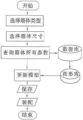 在設(shè)計(jì)多軸箱箱體時(shí),要求用戶選擇多軸箱類型,多軸箱類型分為臥式和立式兩種,其區(qū)別在于前蓋的厚度,然后選擇箱體尺寸,在主控程序中,提供了所有多軸箱的箱體尺寸,避免了查表,便于選擇標(biāo)準(zhǔn)化多軸箱。將多軸箱的箱體尺寸作為查詢條件,在箱體參數(shù)數(shù)據(jù)庫中提取所有設(shè)計(jì)參數(shù),并傳遞給圖形庫中的箱體三維模型,模型按照提供的參數(shù)更新后,用戶選擇保存,在需要的時(shí)候可以裝配到裝配件文件中,多軸箱設(shè)計(jì)流程如圖2所示。