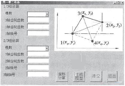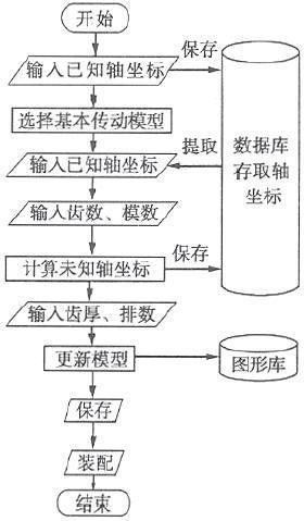 基本傳動(dòng)模型模塊包括圖形庫、數(shù)據(jù)庫和主控程序三部分。圖形庫包括全參數(shù)化的齒輪模型,數(shù)據(jù)庫中存放所有傳動(dòng)軸和主軸的坐標(biāo),以便計(jì)算時(shí)調(diào)入,主控程序完成坐標(biāo)計(jì)算、數(shù)據(jù)訪問以及模型更新等操作。在進(jìn)行組合機(jī)床設(shè)計(jì)系統(tǒng)時(shí),首先為每根傳動(dòng)軸和主軸編號,并且將已知軸坐標(biāo)存放在數(shù)據(jù)庫中;然后選擇需要的基本傳動(dòng)模型,經(jīng)過計(jì)算得出未知軸坐標(biāo)并存放于數(shù)據(jù)庫,最后建立模型。