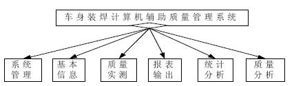 清華大學(xué)開發(fā)的車身裝焊質(zhì)量信息管理系統(tǒng)在數(shù)據(jù)庫(kù)建模和設(shè)計(jì)的基礎(chǔ)上,運(yùn)用計(jì)算機(jī)及網(wǎng)絡(luò)技術(shù)實(shí)現(xiàn)了對(duì)裝焊工藝、質(zhì)量檢測(cè)、統(tǒng)計(jì)過程控制與診斷、報(bào)表輸出的網(wǎng)絡(luò)化管理。其總體結(jié)構(gòu)如圖4所示,包括如下主要功能: