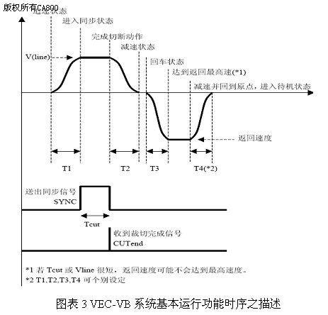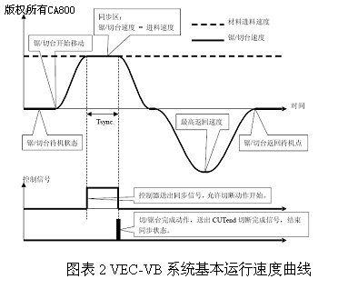 一旦進入同步狀態(tài),VEC-VB立刻送出同步信號給鋸/切臺控制機構(gòu),要求執(zhí)行切斷動作。同時,VEC-VB依然持續(xù)偵測進料長度及進料速度,隨時保持鋸/切臺與材料之間的動態(tài)相對位置永遠(yuǎn)不變;如此才能確保裁切斷面的平整。當(dāng)裁切完成之后,切刀自動退出,并發(fā)出裁切完成信號。VEC-VB接收到本信號,則不再繼續(xù)維持同步,立刻進入減速狀態(tài)。