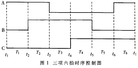 矩角特性是步進(jìn)電機(jī)運(yùn)行時(shí)一個(gè)很重要的參數(shù),矩角特性好,步進(jìn)電機(jī)啟動(dòng)轉(zhuǎn)矩就大,運(yùn)行不易失步。改善矩角特性一般通過(guò)增加步進(jìn)電機(jī)的運(yùn)行拍數(shù)來(lái)實(shí)現(xiàn)。三相六拍比三相二拍的矩角特性好一倍,因此在很多情況下,三相步進(jìn)電機(jī)采用三相六拍運(yùn)行方式。三相步進(jìn)電機(jī)工作在三相六拍運(yùn)行方式時(shí),每個(gè)狀態(tài)的變化使電機(jī)轉(zhuǎn)動(dòng)1/6齒距,三相激勵(lì)規(guī)律為A-AB-B-BC-C-CA共六拍,對(duì)應(yīng)時(shí)序如圖1所示。A、B、C分別代表接到三相步進(jìn)電機(jī)A相、B相、C相繞組的驅(qū)動(dòng)脈沖。