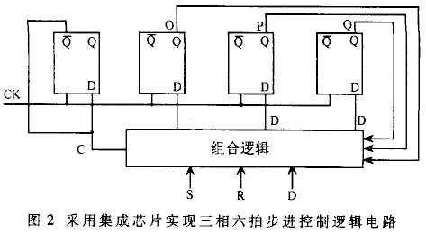 若采用集成電路芯片來(lái)實(shí)現(xiàn)三相六拍步進(jìn)電機(jī)的控制,所用器件較多,電路一般比較復(fù)雜。為了滿足電機(jī)轉(zhuǎn)速的二分頻,在同一時(shí)鐘頻率控制下,必須利用一個(gè)D型觸發(fā)器,通過(guò)C參與組合邏輯來(lái)實(shí)現(xiàn)。其邏輯電路如圖2所示。CK為控制信號(hào),三個(gè)D型觸發(fā)器的輸出O、P、Q分別接步進(jìn)電機(jī)的三項(xiàng)繞組。根據(jù)步進(jìn)電機(jī)驅(qū)動(dòng)相數(shù)及控制要求,必須有相應(yīng)于相數(shù)的延遲觸發(fā)器保持現(xiàn)態(tài)與次態(tài)間的轉(zhuǎn)換過(guò)程。對(duì)此,可利用GAL中八個(gè)輸出邏輯宏單元中的三個(gè)來(lái)完成,電機(jī)的工作狀態(tài)(O、P、Q)中的現(xiàn)態(tài)與控制信號(hào)(S、R、D)可通過(guò)GAL的與、或陣列組合邏輯來(lái)完成。