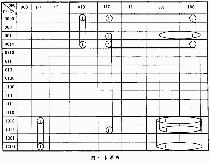 以O(shè)為例,由狀態(tài)真值表可得其卡諾圖,如圖3所示。根據(jù)圈數(shù)和最小項(xiàng)可得其邏輯表達(dá)式為: