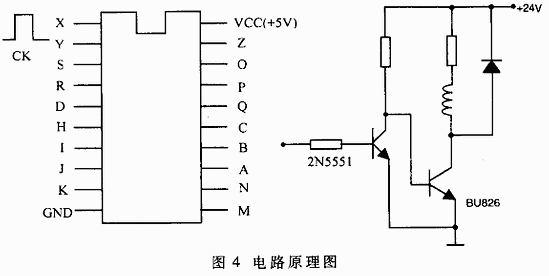 電路原理圖如圖4所示,左邊為GALl6V8芯片的引線圖,S、D、R分別決定電機(jī)的啟動(dòng)、轉(zhuǎn)向和轉(zhuǎn)速大小,輸出O、P、Q分別接電機(jī)的A、B、C三個(gè)線包。圖中只給出一個(gè)線包的驅(qū)動(dòng)電路。注意:GAL元件不用的引腳應(yīng)該直接接地或接電源,不要懸空,否則會(huì)增大功耗,降低抗干擾能力。 這種主要由GALl6V8組成的步進(jìn)電機(jī)控制器用于對(duì)三相六拍工作制步進(jìn)電機(jī)的自動(dòng)控制,既可以獨(dú)立運(yùn)用于驅(qū)動(dòng)對(duì)象,又可以在微機(jī)管理下運(yùn)行,且不占用CPU的時(shí)間。用一片GAL便可以實(shí)現(xiàn)復(fù)雜的時(shí)序電路,縮小組成系統(tǒng)的體積。借助計(jì)算機(jī)輔助設(shè)計(jì),大大加快了設(shè)計(jì)速度,減少了差錯(cuò),降低了成本,提高了系統(tǒng)的可靠性和穩(wěn)定性,且可反復(fù)修改和編程,靈活性極強(qiáng)。