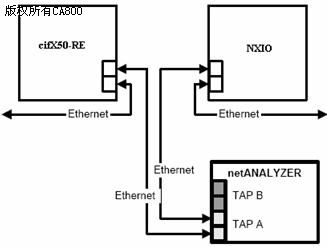 不同的硬件連接方式所測試的數(shù)據(jù),可分析實(shí)時以太網(wǎng)設(shè)備的不同性能和參數(shù),(具體參考德國赫優(yōu)訊netANALYZER產(chǎn)品應(yīng)用手冊),本文采用其中一種連接方式,netANALYZER的連接如圖3,此連接方式可以分析錯誤報(bào)文、循環(huán)周期、時間抖動等信息。