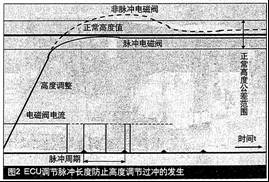 ECAS ECU采用脈沖方式控制電磁閥的開(kāi)啟,根據(jù)當(dāng)前實(shí)際高度與預(yù)期調(diào)節(jié)高度的偏差,ECU計(jì)算電磁閥的調(diào)節(jié)脈沖長(zhǎng)度,如果需要調(diào)節(jié)的高度量大、由于沒(méi)有過(guò)沖的危險(xiǎn)ECU將給出一個(gè)長(zhǎng)的脈沖,同時(shí),快的上升速度將減小脈沖長(zhǎng)度,這樣就能精確控制車輛的高度調(diào)節(jié)速度,極大的避免了高度的過(guò)沖及振蕩調(diào)節(jié)。如圖2所示。