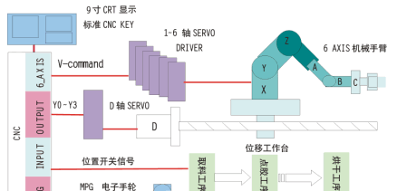 數(shù)控系統(tǒng)選用中達(dá)六軸數(shù)控系統(tǒng),它是機(jī)械手臂的控制中心,除具有線性插補(bǔ)等運(yùn)動(dòng)控制外,還能夠進(jìn)行畫(huà)面顯示、參數(shù)設(shè)定、程序編輯、PLC邏輯控制等。
